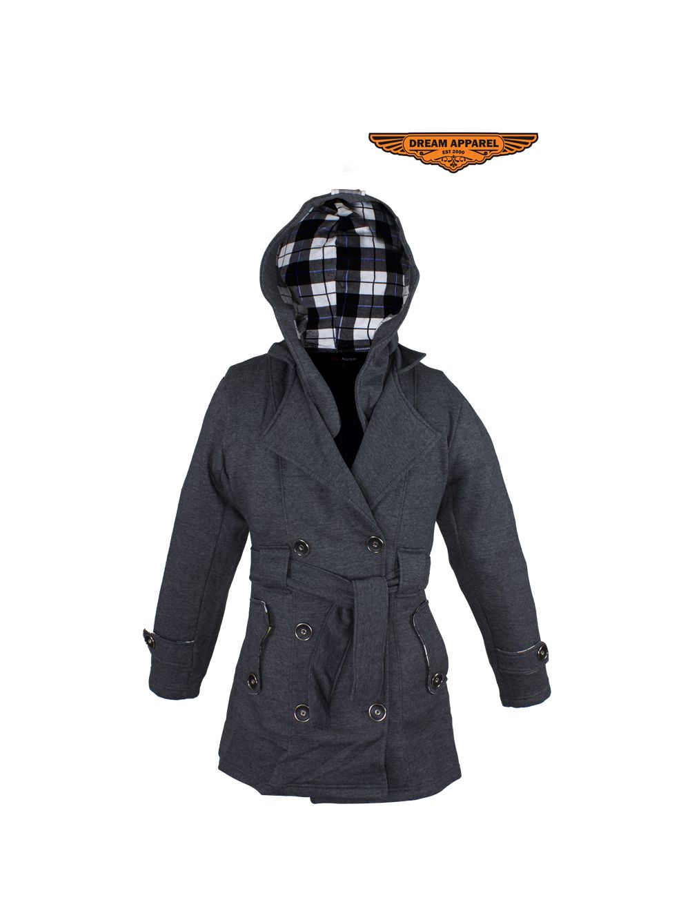 Ladies Dark Grey Button Up Coat W/ Belt and Removable Hood