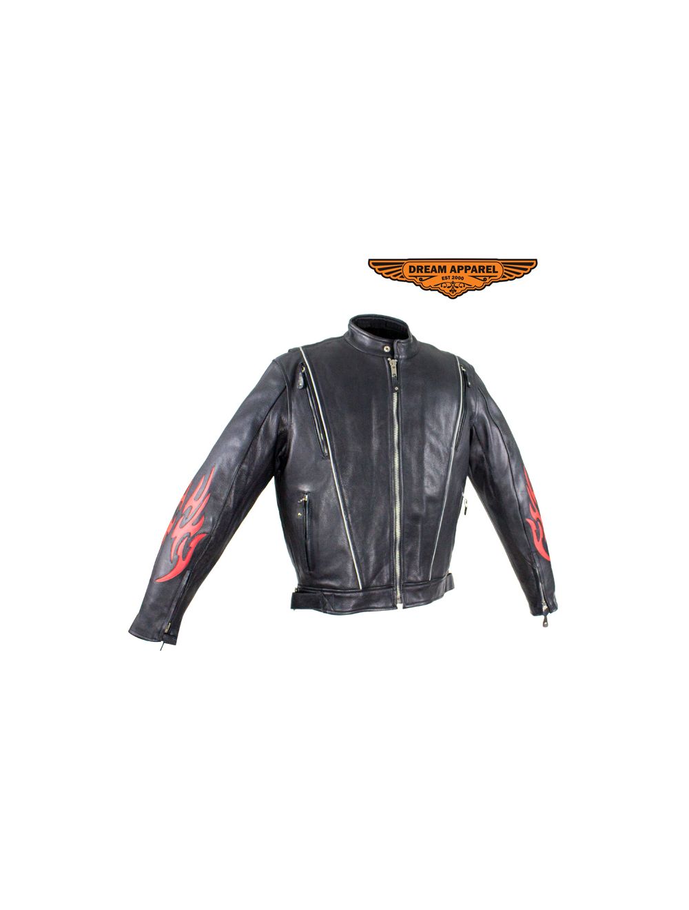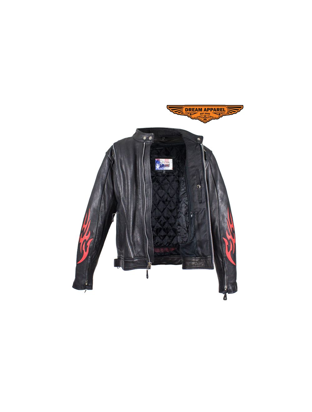 - Vibrant red flame design on sleeves and back