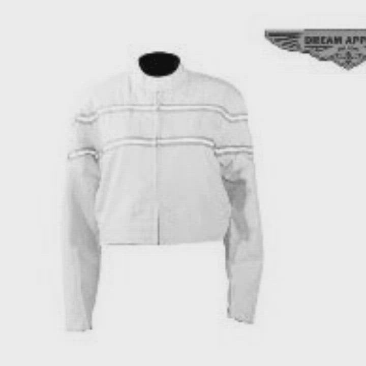 - Ladies, what a perfect way to start off the year with our beautiful new racer style textile jacket in light pink featuring dual stripes in white